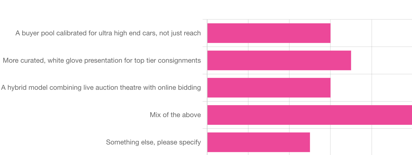 Several responses hit on this from different angles. The idea of a separate, clearly delineated high-end online format. A platform running a top-tier event differently, not louder, not broader, but more focused. Others pointed out something that is rarely said out loud. At the very top end, many collections are effectively sold before they hit the block. Guarantees. Financial backstops. Safety in numbers. The Bachman sale was described, memorably, as a Ferrari ETF bought one stock at a time.