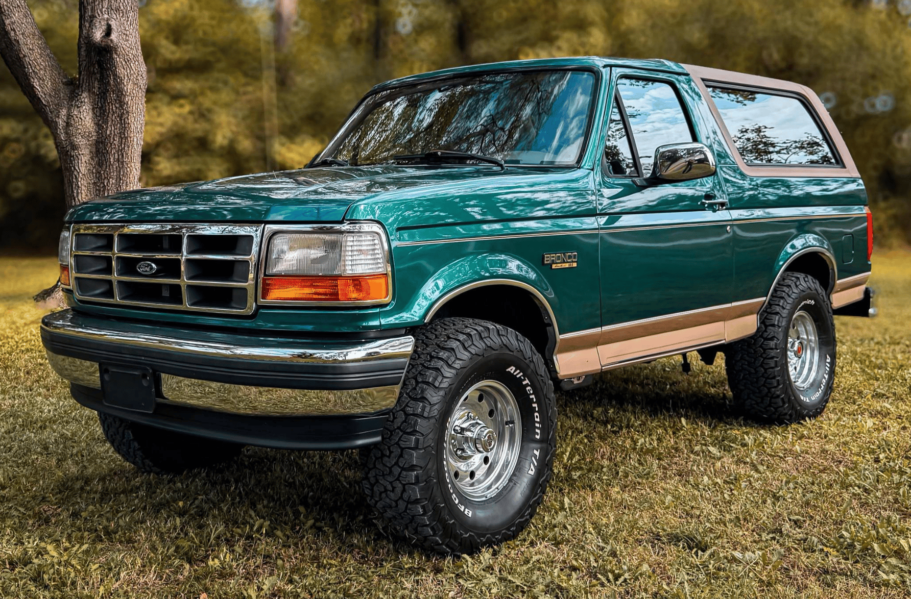 The color combo is peak nineties Ford. The Eddie Bauer trim gives it that upscale outdoors look, and the 5.8 liter V8 with four wheel drive delivers all the charm people want from the last generation Broncos. Most of these have lived hard lives. Lift kits, rust, deer hits, questionable mods, you name it. This one feels like it dodged all the usual traps. The frame looks clean, the interior is still soft, and the overall presentation is far better than what usually hits the market.