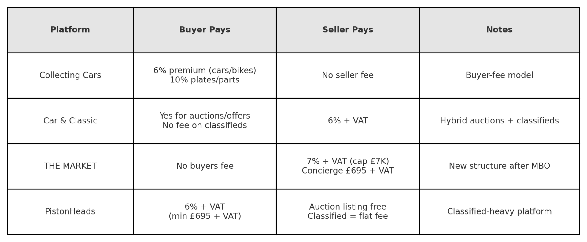 If you watch the UK scene, you know how competitive it is. Collecting Cars, Car and Classic, The Market and PistonHeads are the major players all fighting for the same audience. It is far tighter than anything we see in the US. Fee structures are not uniform either. Some platforms lean buyer side, some lean seller side and some do both. So any shift in pricing is a signal.
