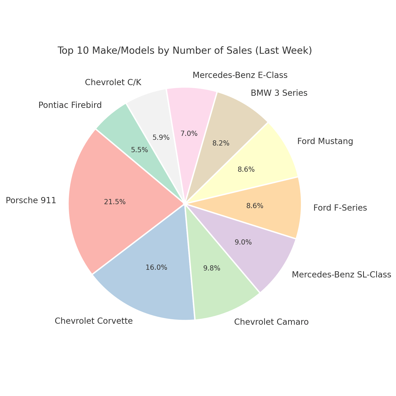 Porsche 911s once again dominated both by volume and value, while Corvettes and Mustangs continued to prove that mainstream icons can keep pace with the high-end crowd. Ford’s trucks found their way back into the top ten, joined by a few Pontiac Firebirds that stirred some nostalgia among bidders. It was a well-balanced week, strong prices at the top, steady movement through the middle, and plenty of variety to keep the market lively heading into November.