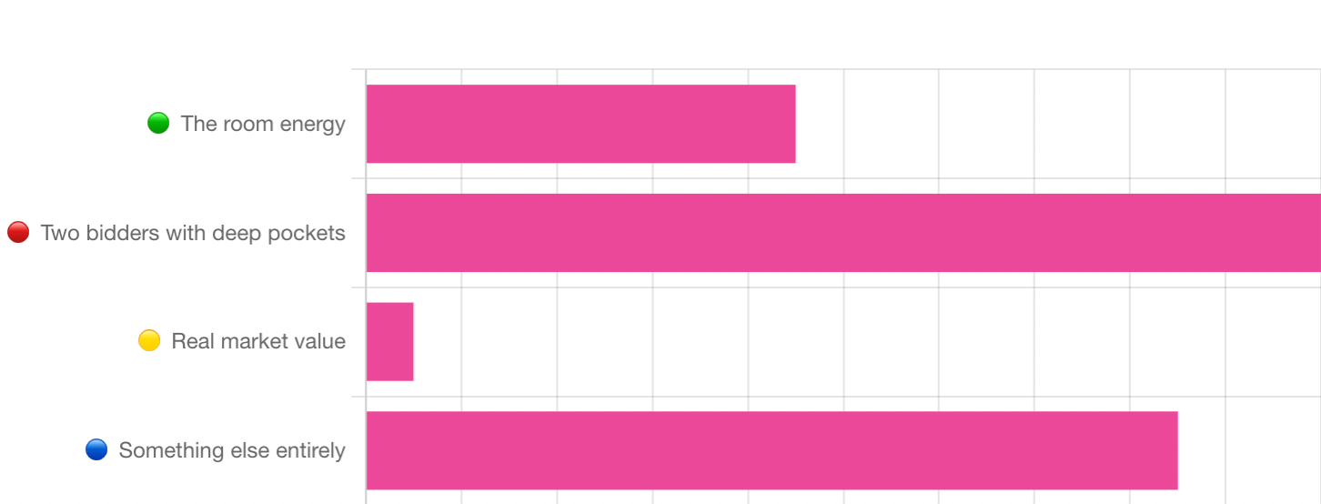 The no reserve model and bidders get free alcohol. Then add a live tv broadcast and a camera on the bidder bidding or worse a bidder that stops bidding on camera, this adds a component of unmeasurable pressure. The results are obvious…